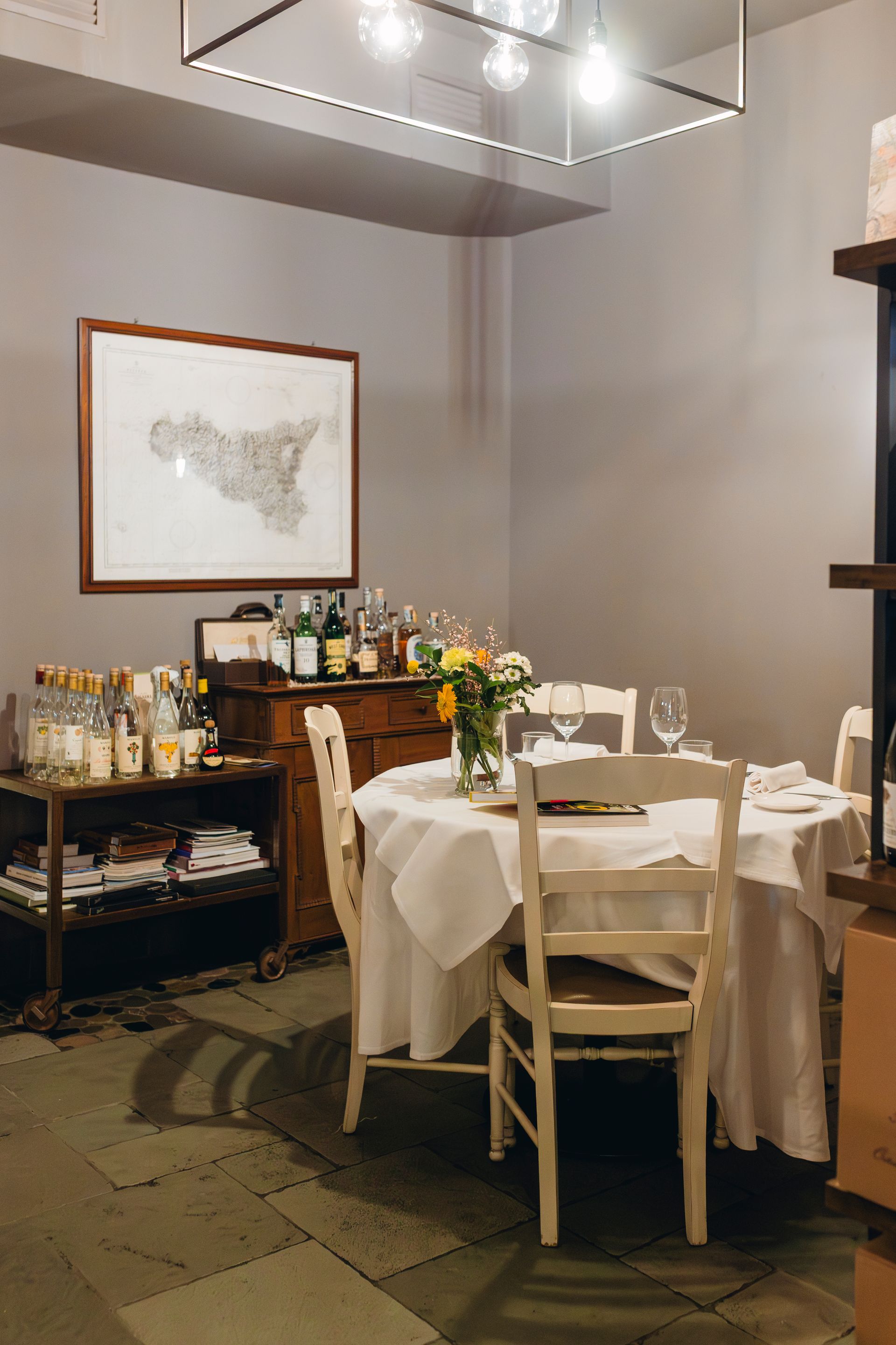 Nel pieno rispetto del carattere della nostra terra di Sicilia abbracciamo uno stile in cucina semplice e naturale, dove si predilige l'amore per la cucina e la passione per il mangiare sano. Tutti i nostri piatti sono costruiti partendo da ingredienti di qualità e di stagione, molti dei quali provengono direttamente dalla Sicilia come i pomodori, i formaggi, le erbe, l'olio e molti dei nostri vini.